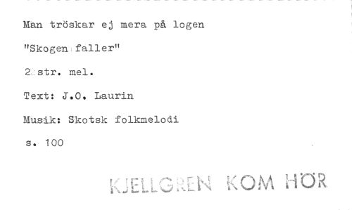 //// Mån tröskar ej mera på logen "Skogen faller" //// mel. //// Text: J.0. Laurin //// Musik: Skotsk folkmelodi s. 100 //// \kr/ 7- N K OM R ////