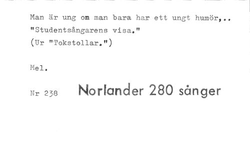 //// Man är ung om man bara har ett ungt humör,.. "Studentsångarens visa." //// (Ur "Tokstollar.") //// Nr 238 Norlander 280 sånger ////