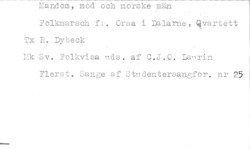 //// Mandom, mod och morske män //// Folkmarsch Orsa i Dalarne, vartett //// Tx R. Dybeck //// Mk :)v. Folkvisa lids. af C.J.0. Lanrin Flerst. Sange af btutdentersangfor. nr 25 ////