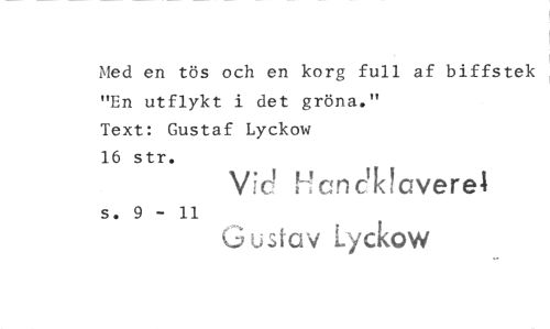 //// Med en tös och en korg full af biffstek "En utflykt i det gröna." //// Text: Gustaf Lyckow //// 16 str. //// Vid HandHaverel //// s. 9 - //// ustav Lyckow ////