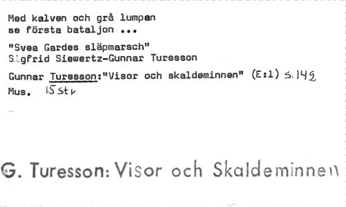 //// Med kalven och grå lumpen //// se första bataljon .8. //// "Svea Gardes släpmarsch" //// SAlfrid Siewertz—Gunnar Tureeson //// Gunnar Turesson:"Visor och skaldeminnen" (E:1) 5, ... - //// Mus. ISStP //// G. Turesson: Visor och Skaideminnen ////