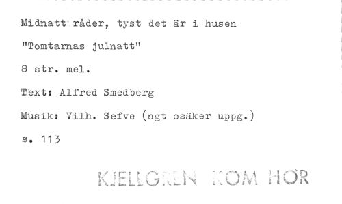 //// Midnattråder, tyst det är i husen "Tomtarnas julnatt" //// 8 str. mel. //// Text: Alfred Smedberg //// MUsik: Vilh. Sefve (ngt osäker uppg.) s. 113 //// LL.7: :Ok\ 'ti-1(iR ////