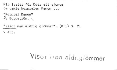 //// Mig lyster för Eder att sjunga Om gamle korpralen Kanon ... //// "Korpral Kanon" 0. Borgström. //// 6Visor man aldrig glömmer". (D:1) S. 21 //// 9 str. //// Visor ^Ilari aldr.jiörnmer ////