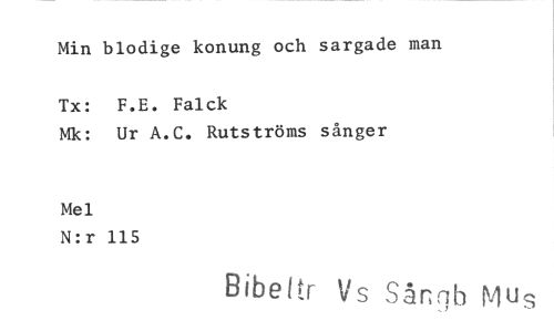 //// Min blodige konung och sargade man //// Tx: F.E. Falck //// Mk: Ur A.C. Rutströms sånger //// Mel //// N:r 115 //// Bibeltr Vs Sångb Mus ////