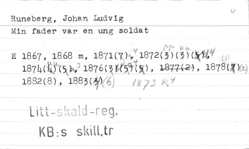 //// Runeberg, Johan Ludvig //// Min fader var en ung soldat //// P* ko. //// E 1867, 1868 m, 1871C04,. 1872(3)(5)(X4i7 1874(tY(' 1876(vmx?, L877(2), 1878(4)4 //// 1882(8), 1883(4mj /2/7,3 //// KB:s skitt.tr ////