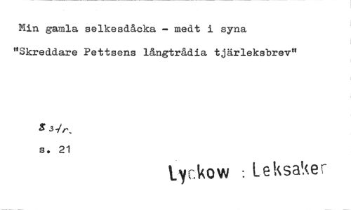 //// Min gamla selkesdåcka — medt i syna "Skreddare Pettsens långtrådia tjärleksbrev" //// g sir, //// s. 21 //// Lyekow : leksaker ////