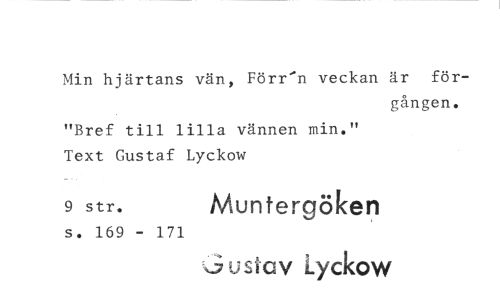 //// Min hjärtans vän, Förr'n veckan är för- //// gången. //// "Bref till lilla vännen min." //// Text Gustaf Lyckow //// 9 str. Muntergöken //// s. 169 - 171 kiv Lyckow ////