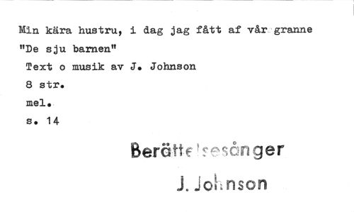//// Min kära hustru, i dag jag fått af vår:granne "De sju barnen" //// Text o musik av J. Johnson //// 8 str. //// s. 14 //// Berättt Ps.esån ger //// J. JoLnson ////
