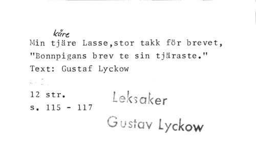 //// kiire //// Min tjäre Lasse,stor takk för brevet, //// "Bonnpigans brev te sin tjäraste." Text: Gustaf Lyckow //// 12 str. Lek3aker //// s. 115 - 117 G:istav Lyckow ////