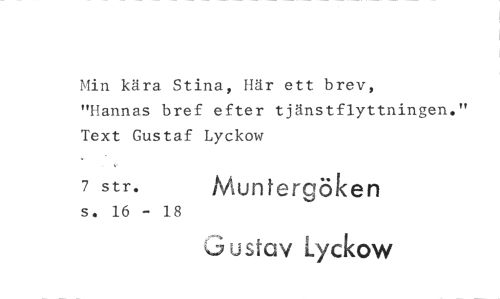 //// Min kära Stina, Här ett brev, //// "Hannas bref efter tjänstflyttningen." Text Gustaf Lyckow //// 7 str. Muntergöken //// s. 16 - 18 //// ustav lyckow ////