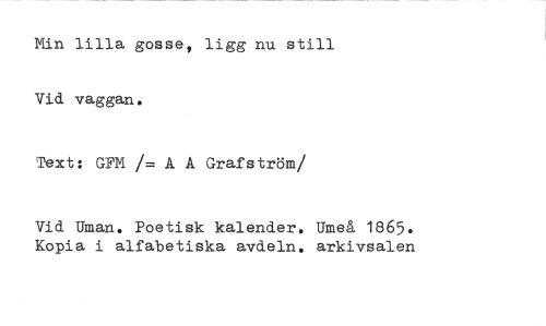 //// Min lilla gosse, ligg nu still Vid vaggan. //// Text: GFM /. A A Grafström //// /Vid Uman. Poetisk kalender. Umeå 1865. //// Kopia i alfabetiska avdeln. arkivsalen ////