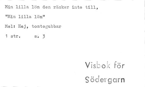 //// Min lilla lön den räcker inte till, //// "Min lilla lön" //// Mel: Hej, tomtegubbar //// 1 str. 3 //// Visb.ok or //// • //// Soaergarn ////