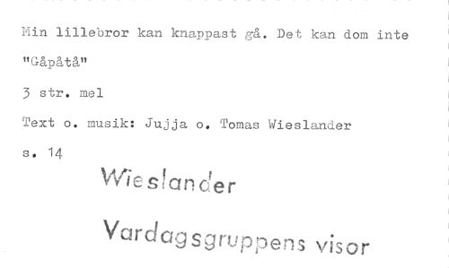 //// Min lillebror kan knappast gå. Det kan dom inte "Gåpåtå" //// 3 str. mel //// Text o. musik: Jujja o. Tomas Wieslander s. 14 //// Wieslander //// Vardagsgruppens visor ////