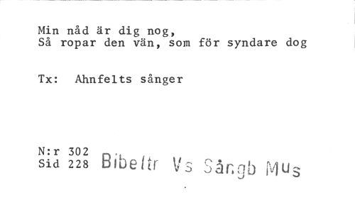 //// Min nåd är dig nog, //// Så ropar den vän, som för syndare dog //// Tx: Ahnfelts sånger //// N:r 302 rvt //// Sid 228 Di weltr Vs bangb Mus ////