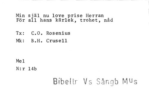 //// Min själ nu love prise Herran För all hans kärlek, trohet, nåd //// Tx: C.O. Rosenius Mk: B.H. Crusell //// Mel //// N:r 14b //// Bibettr Vs Sångb Mus ////
