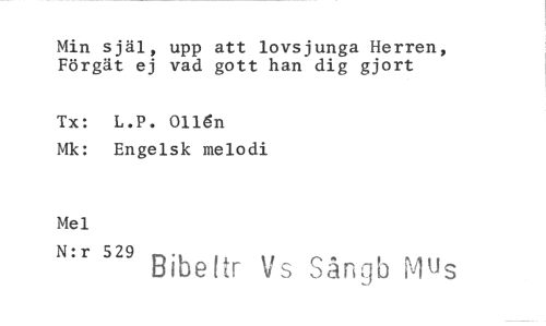 //// Min själ, upp att lovsjunga Herren, Förgät ej vad gott han dig gjort //// Tx: L.P. 01161 //// Mk: Engelsk melodi //// Mel //// N:r 529 . //// Bibettr Vs Sångb Mus ////