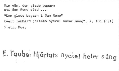 //// Min vän, den glade bagarn uti San Remo stad ... //// "Den glade bagarn i San Remo" //// Evert Taube:"Hjärtats nyckel heter sång", s. 106 (E:1) 5 str.'Mus. //// Taube: Hjärtats nyckel heter sån ////