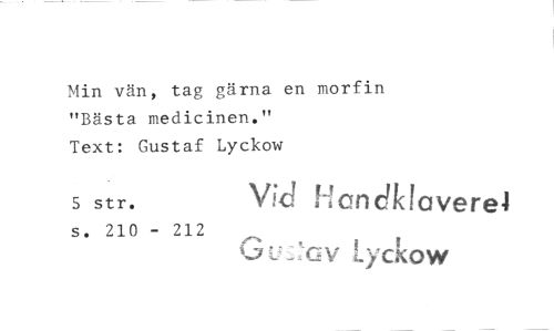 //// Min vän, tag gärna en morfin "Bästa medicinen." //// Text: Gustaf Lyckow //// 5 str. Vid en dklaverei //// s. 210 - 212 1.—CkOW ////
