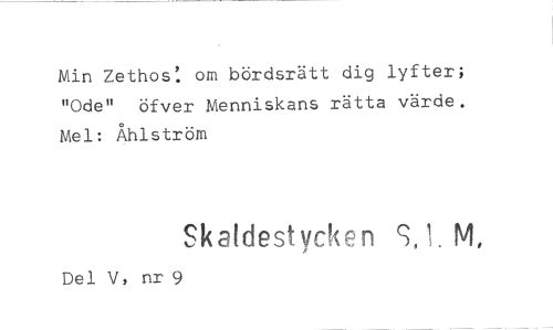 //// Min Zethos: om bördsrätt dig lyfter; "Ode" öfver Menniskans rätta värde. Mel: Åhlström //// Skaidestyck n S,1. M, //// Del V, nr 9 ////