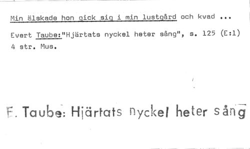 //// Min älskade hon gick sig i min lustgård och kvad ... //// Evert Taube:"Hjärtats nyckel heter sång", s. 125 (E:1) 4 str. Mus. //// Taui3e: Hjärtats nyckel heter sånd ////