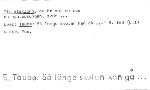 //// Min älskling, du är som en ros en nyutsprungen, skär ... //// Evert Taube:"Så länge skutan kan gå ..." S. 168 (E:1) 4 str. Mus. //// 0 //// E. Taube: Så länge sKuten kan ga ////