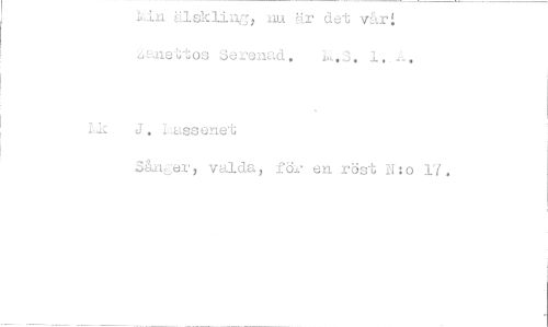 //// kin älskling, nu är det vårt //// Zanettos Serenad. k.S. 1.. A. //// kh J. Lassenet //// Zän,-„er, valda, föl. en röst N:o 17. ////