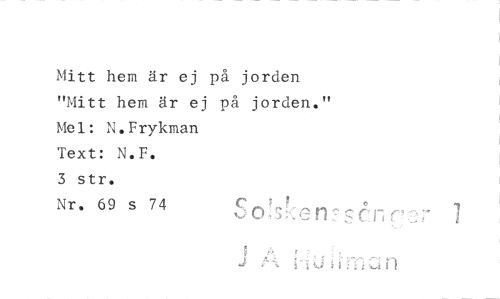 //// Mitt hem är ej på jorden "Mitt hem är ej på jorden." Mel: N. Frykman 3 1 //// Text: N.F. //// 3 str. //// Nr. 69 s 74 C . ////