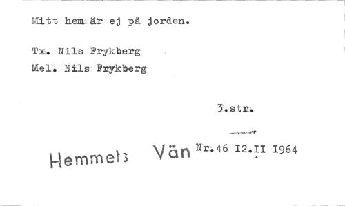 //// Mitt herw är ej på jorden. //// Tx. Nils Prykberg Mel. Nils Prykberg //// stn. //// 1-lemmel3 Vän Nr446 12.1i 1964 ////
