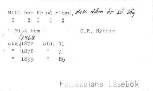 //// Mitt hem är så ringa A4V-5 46, //// 7Y) ar 4; 1.4 //// tf If It //// tt tt tt tt tt //// " Mitt hem " //// /U3 //// utg.1872 sid. 41 //// It 1878 " 31 //// C.R. Nyblom //// 1899 5 //// ,u ans Läsebok ////