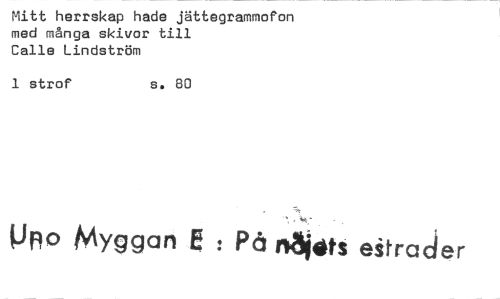 //// Mitt herrskap hade jättegrammofon med många skivor till //// Calle Lindström //// 1 strof s. 80 //// 1.430 Myggan På *gts eitracier ////