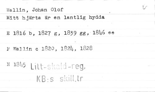 //// Wallin, Johan Olof //// Mitt hjärta är en lantlig hydda //// E 1816 b, 1827 g, 1839 gg,.1846 ee F Wallin c 1820, 1824, 1828 //// N 1845 j reg, //// KB: skilt tr ////