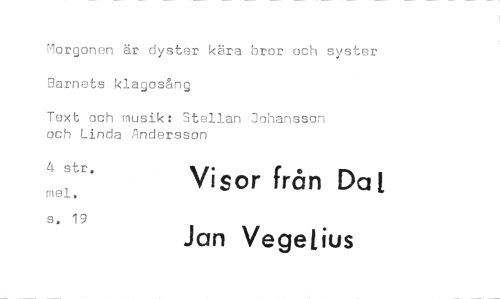 //// Morgonen är dyster kära bror och syster Barnets klagosång //// Text och musik: Stellan Johansson och Linda Andersson //// 4 str. mel. Visor från Dat //// s. 19 Jan Vegetius ////