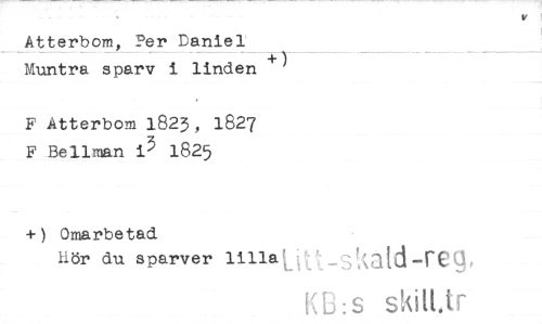 //// Atterbom, Per Daniel _ _ //// • +) //// Muntra sparv i linden F Atterbom 1823, 1827 F Bellman 13 1825 //// +) Omarbetad //// hör du sparver //// KB:s ////
