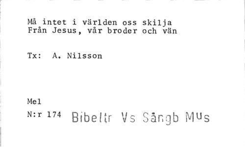 //// Må intet i världen oss skilja Från Jesus, vår broder och vän //// Tx: A. Nilsson //// Mel //// N:r 174 Bibeltr Vs Sårigb Mus ////