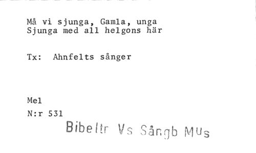 //// Må vi sjunga, Gamla, unga Sjunga med all helgons här //// Tx: Ahnfelts sånger //// Mel //// N:r 531 //// Bibeltr Vs Sån b Mus ////