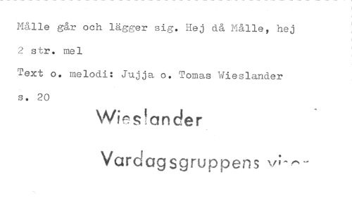 //// Målle går och lägger sig. Hej då Målle, hej 2 str. mel //// Text o. melodi: Jujja o. Tornas Wieslander s. 20 //// Wies!ander //// Vardagsgruppens \A"— ////