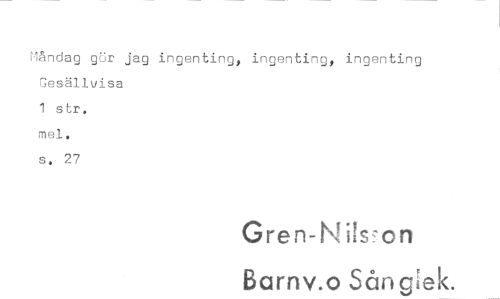 //// Måndag gör jag ingenting, ingenting, ingenting Gesällvisa //// 1 str. //// mel, //// s. 27 //// Gren-Nils-on //// Barnv.o Sång ek. ////