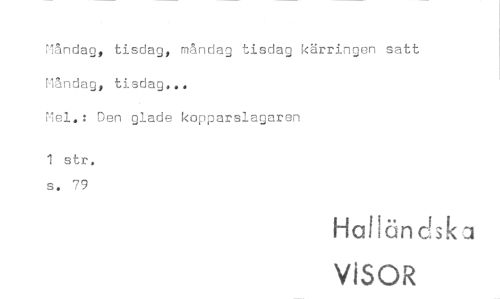 //// Måndag, tisdag, måndag tisdag kärringen satt Måndag, tisdag... //// Mal.: Den glade kopparslagaren //// 1 str, s. 79 //// Halländsk u //// VISOR ////