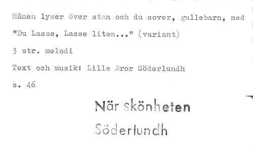 //// Månen lyser över stan och du sover, gullebarn, med "Du Lasse, Lasse liten..." uvariant) //// 3 str. melodi //// Text och musik: Lille Eror Söderlundh //// s. 46 //// Nör rvieten //// c6,,,erfundh ////