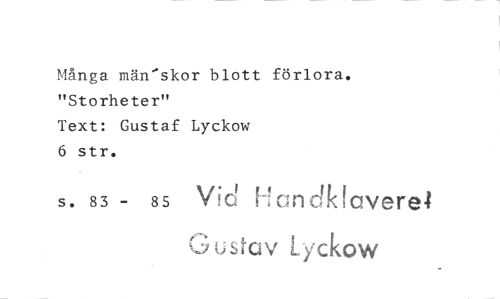 //// Många män'skor blott förlora. "Storheter" //// Text: Gustaf Lyckow //// 6 str. //// s. 83 - xi• i H an elklaver& //// 85 ^I!O //// G ustav Ly-ckow ////