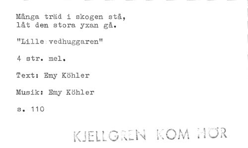 //// Mänga träd i skogen stå, låt den stora yxan gå. //// "Lille-vedhuggaren" 4 str. mel. //// Text: Emy Köhler MUsik: Emy Köhler s. 110 //// " N 0 M //// I LY ////