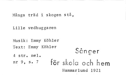 //// Många träd i skogen stå, Lille vedhuggaren //// Musik: Emmy Köhler Text: Emmy Köhler //// 4 str. //// nr 9, s. 7 //// Se:nger //// för skola och hem //// Hammarlund 1921 ////