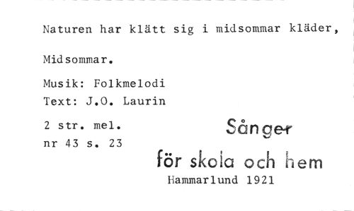 //// Naturen har klätt sig i midsommar kläder, Midsommar. //// Musik: Folkmelodi //// Text: J.0. Laurin //// 2 str. mel. Sånger //// nr 43 s. 23 //// för skola och hern //// hammarlund 1921 ////
