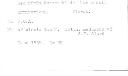 //// Ned ifrån korset blodet har rnnnit Hymnperikop. Flerst. //// Tx J.O.A. //// Lik af Alexis Lvoff. Sättn. meddelad af //// A.F. Alard //// Mon 1868. Nr 38 ////