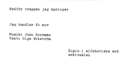 //// Nedför trappan jag springer //// Jag handlar åt mor //// Musik: John Norrman //// Text: Olga Wikström //// Kopia i alfabetiska avd arkivsalen ////