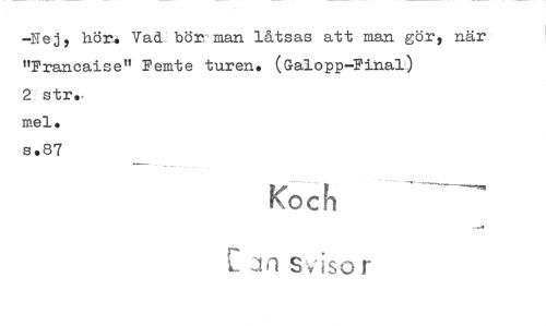 //// -Nej, hör. Vad bör man låtsas att man gör, när "Francaise" Femte turen. (Galopp-Final) //// 2 str., //// mei. //// s.87 //// Kock //// k sv'iso r ////