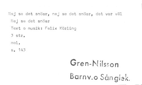 //// Nej se det snöar, nej se det snöar, det var väl Nej se det snöar //// Text o musik: Felix Körling //// 3 str. //// mel. //// s. 143 //// Gren-Nirson //// Barnv.o Sångkk. ////