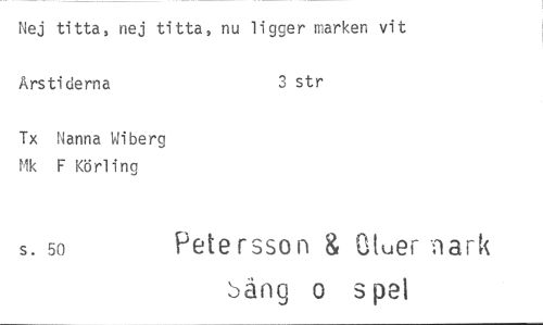 //// Nej titta, nej titta, nu ligger marken vit //// Årstiderna 3 str //// Tx Nanna Wiberg Mk F Körling //// s. 50 Petersson 8, Gluer -nark //// bäng o spel ////