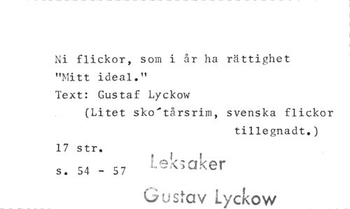 //// Ni flickor, som i år ha rättighet "Mitt ideal." //// Text: Gustaf Lyckow //// (Litet sko'tårsrim, svenska flickor //// tillegnadt.) //// 17 str. //// s. 54 - 57 baker //// G u stav Lyckow ////
