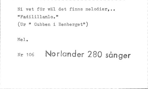 //// Ni vet för väl det finns melodier,.. "Fadilillanlo." //// (Ur " Gubben i Renberget") //// Mei. //// Nr 106 Norlander 280 sånger ////